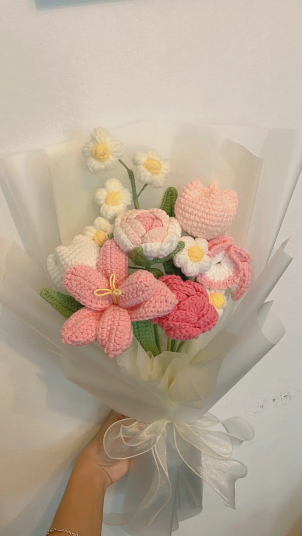 - Flower types: 6-8 stalks of mixed crocheted flowers