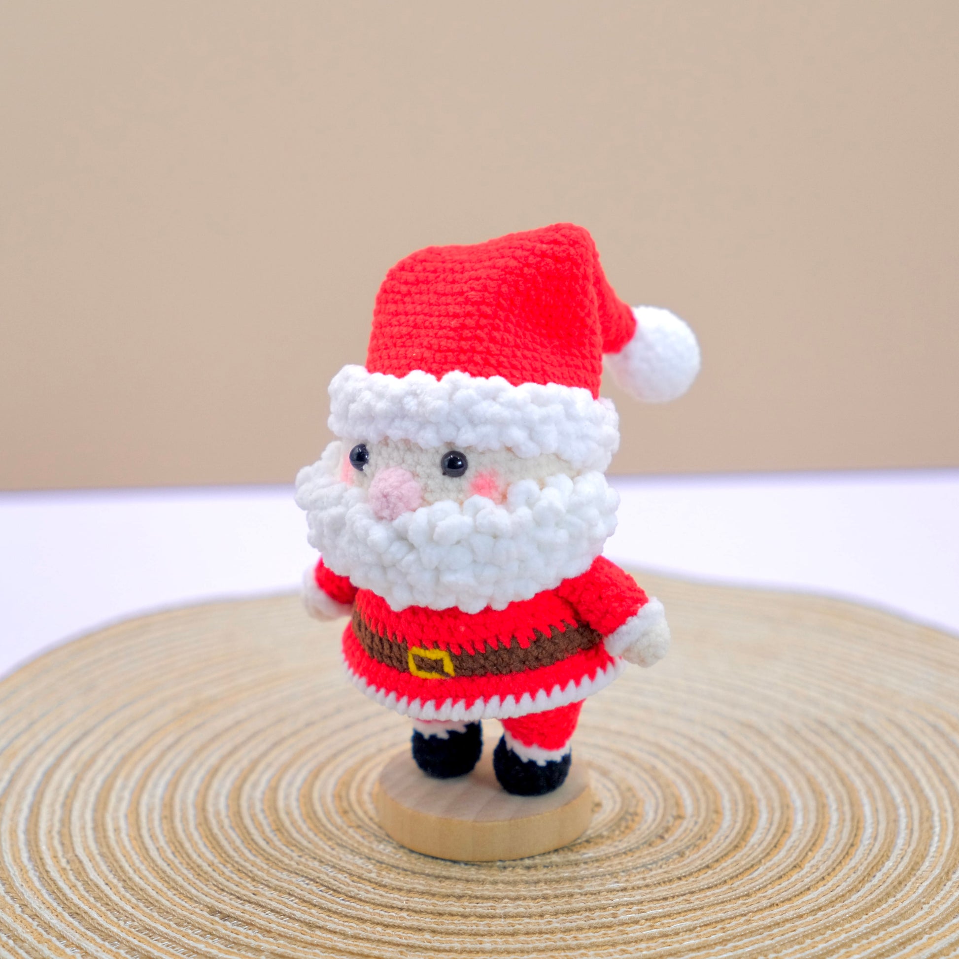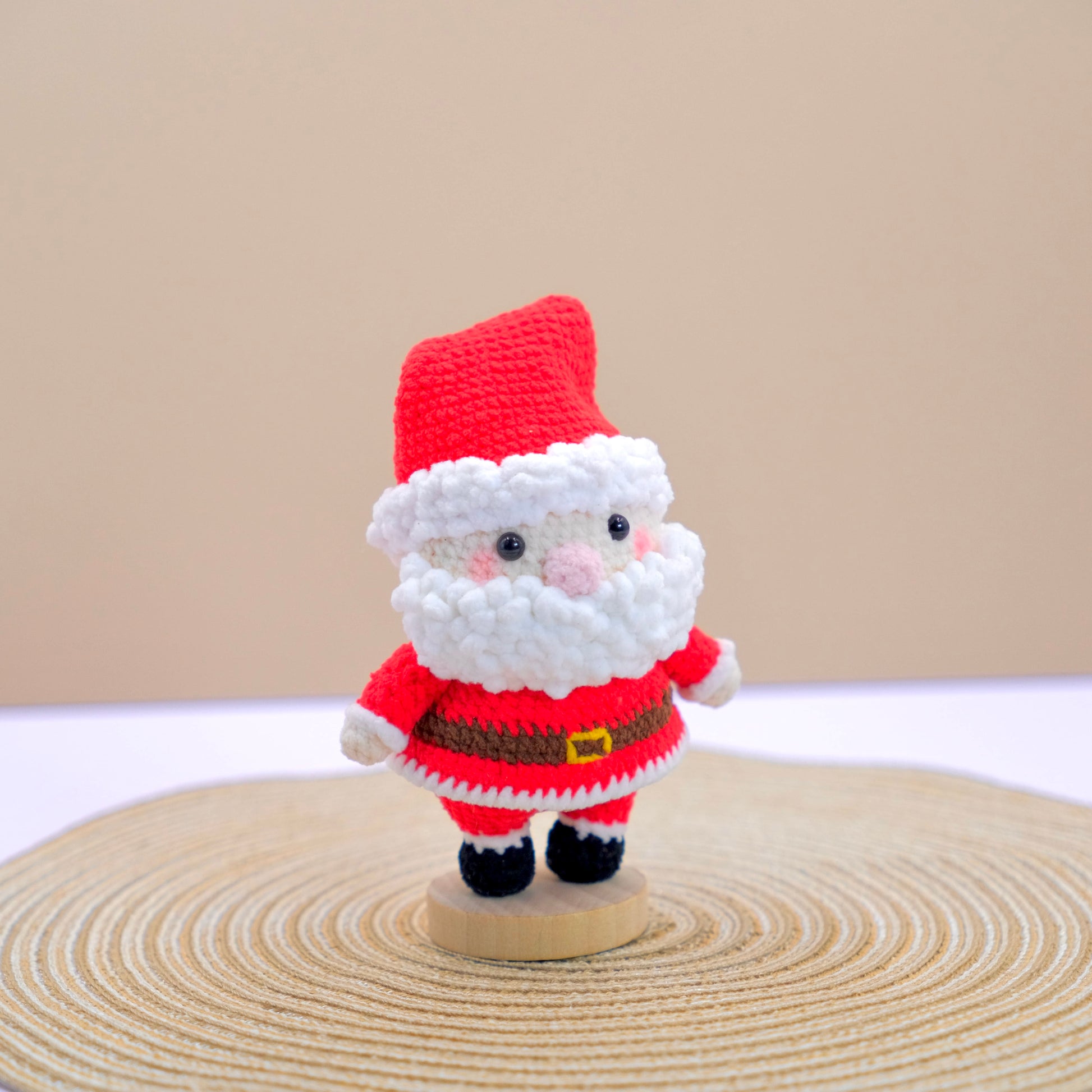 - 1 x Crochet Santa Claus Amigurumi (Hat included) with Wooden Base