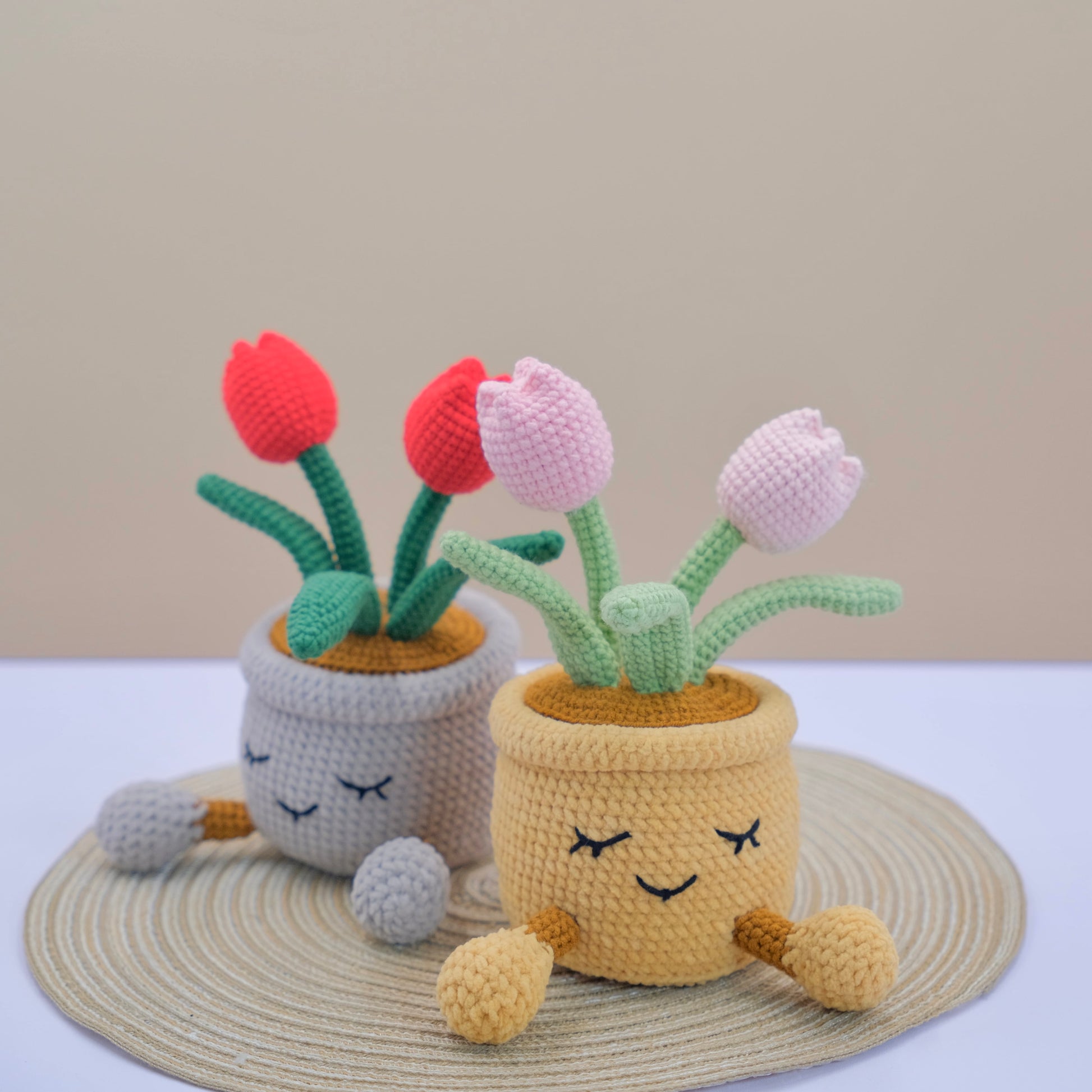 - 2 x Crochet Chubby Tulips in Smiley Potted Garden Vase (Premium Yarn)