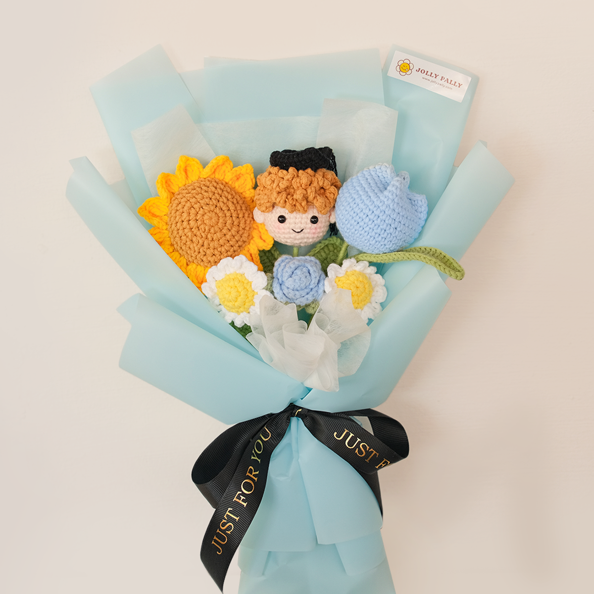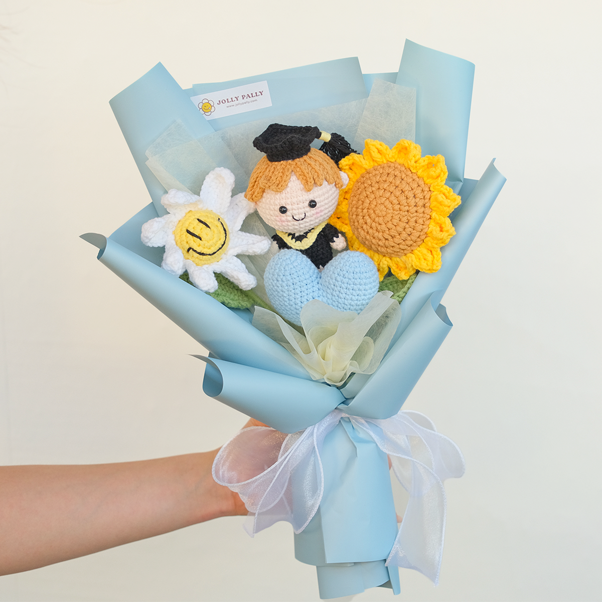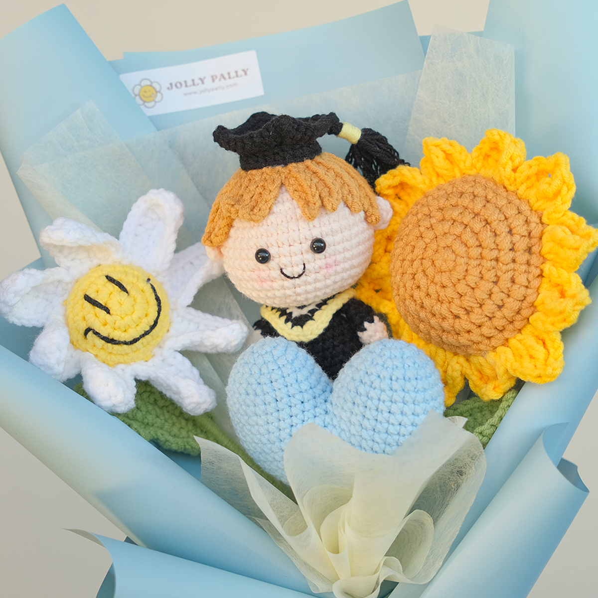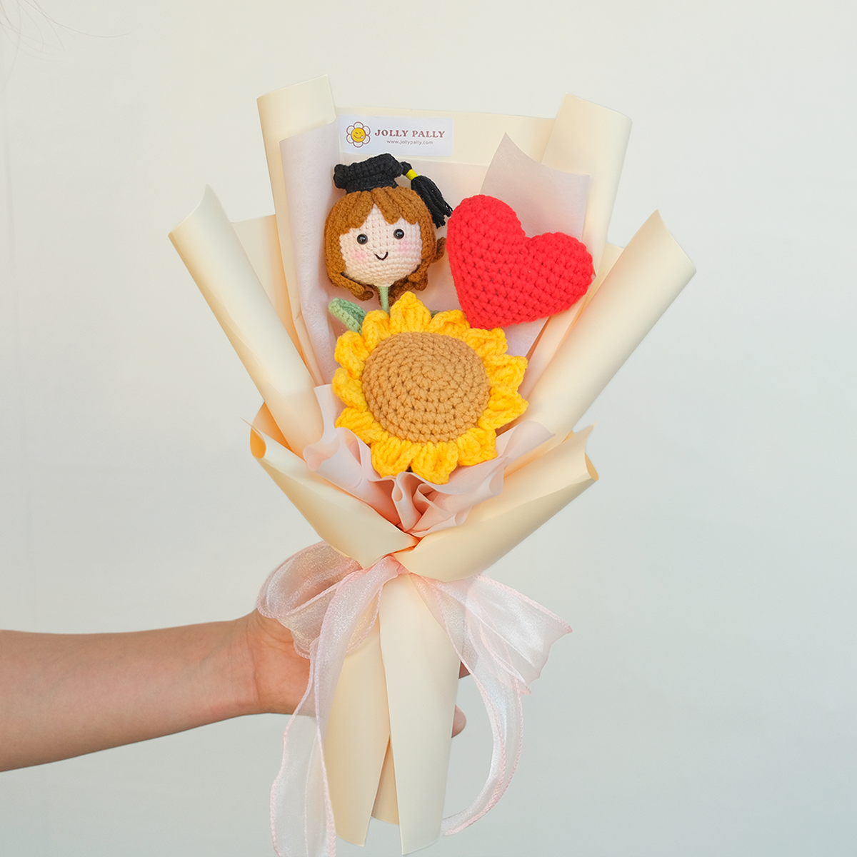 Our Mini Crochet Bloom Sunflower Graduation Bouquet include: