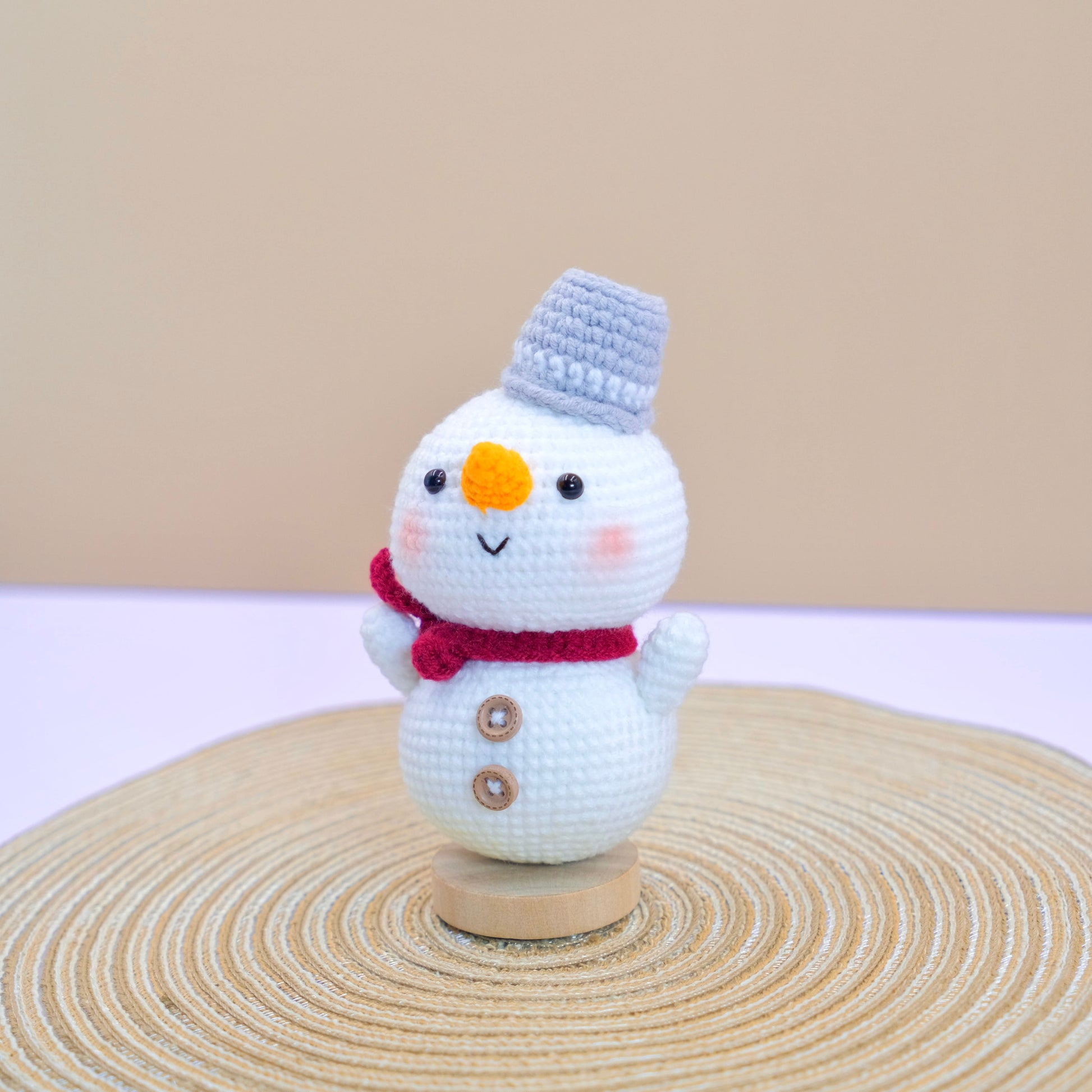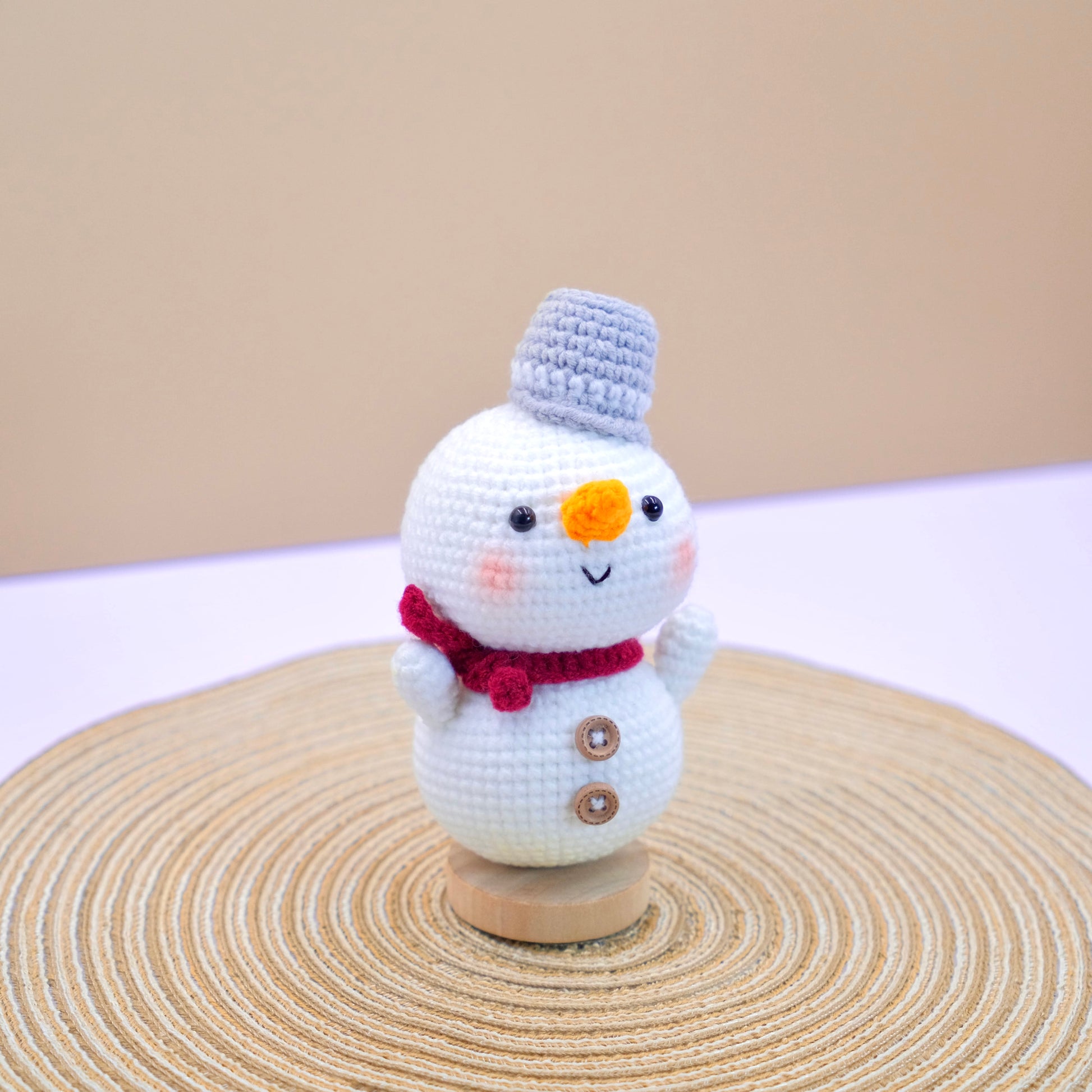 - 1 x Crochet Snowman Amigurumi (hat & scarf included) with Wooden Base