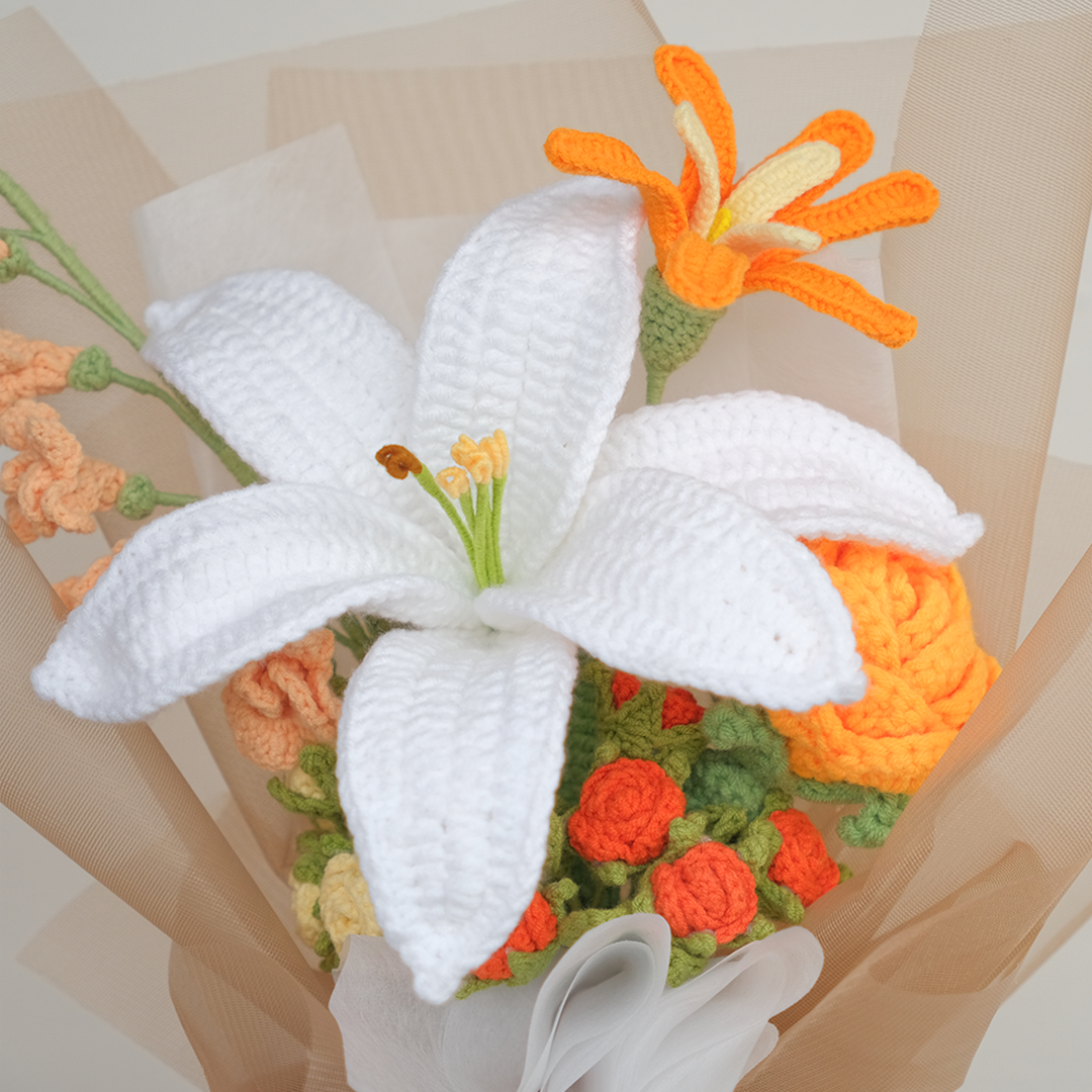 Our Crochet Lily Mix Bouquet includes:- Flower types: 1 premium white lily with pairing flowers